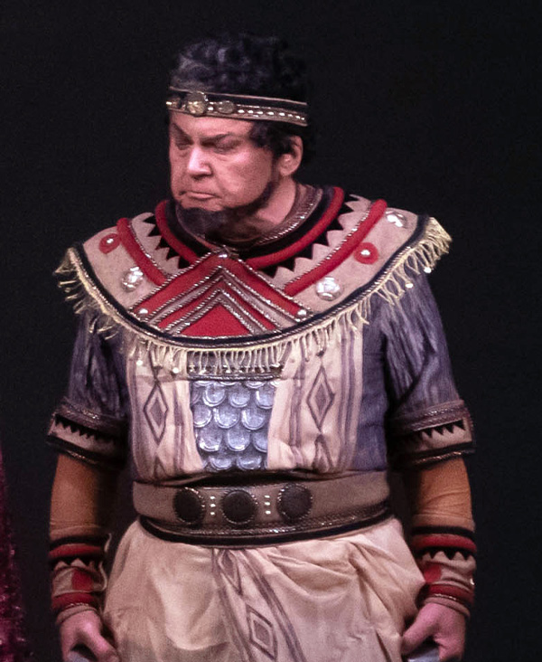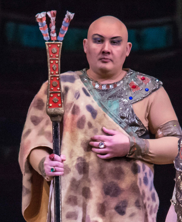 Верховний жрець Рамфіс передає Радамесу освячену зброю.