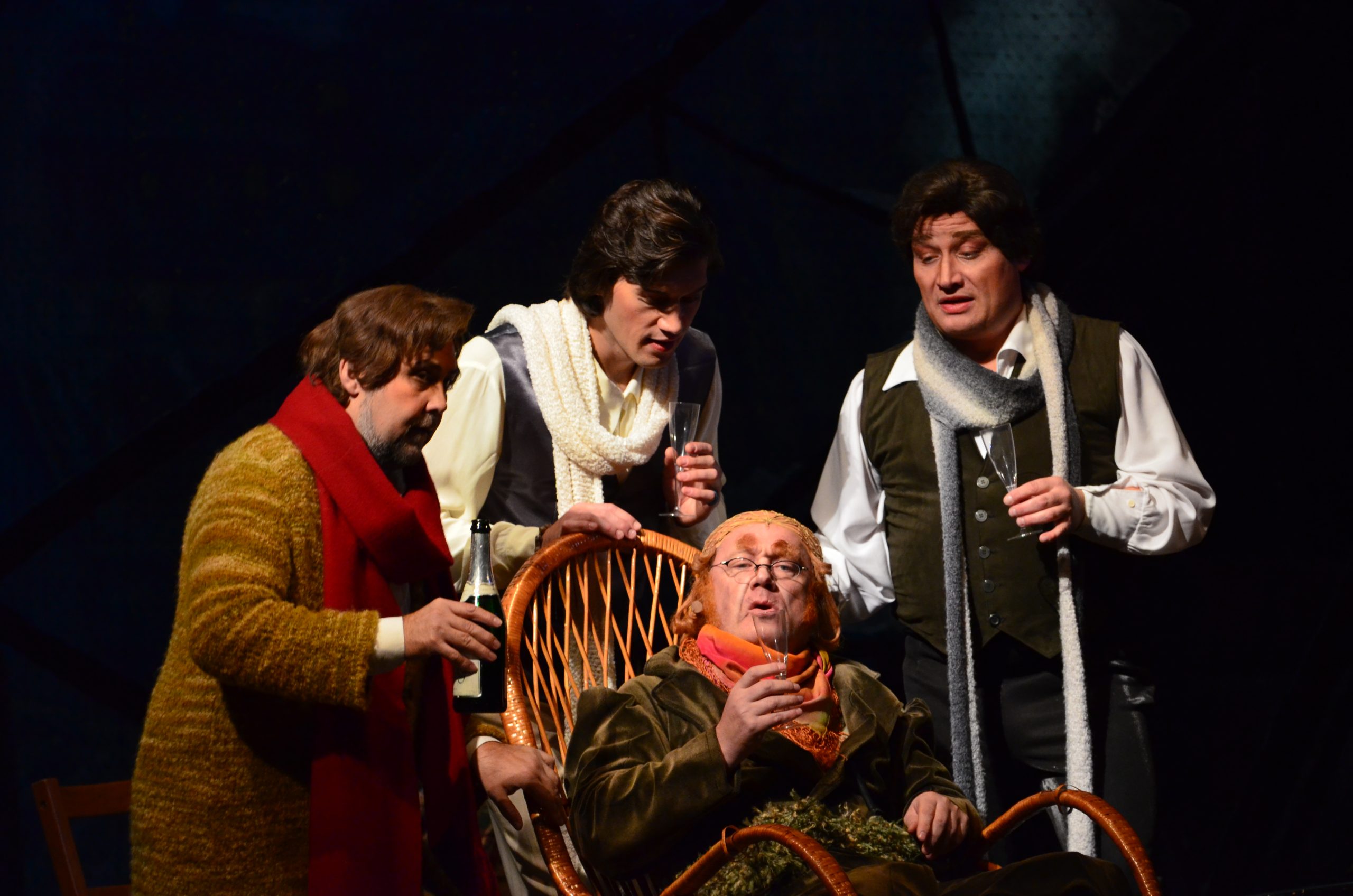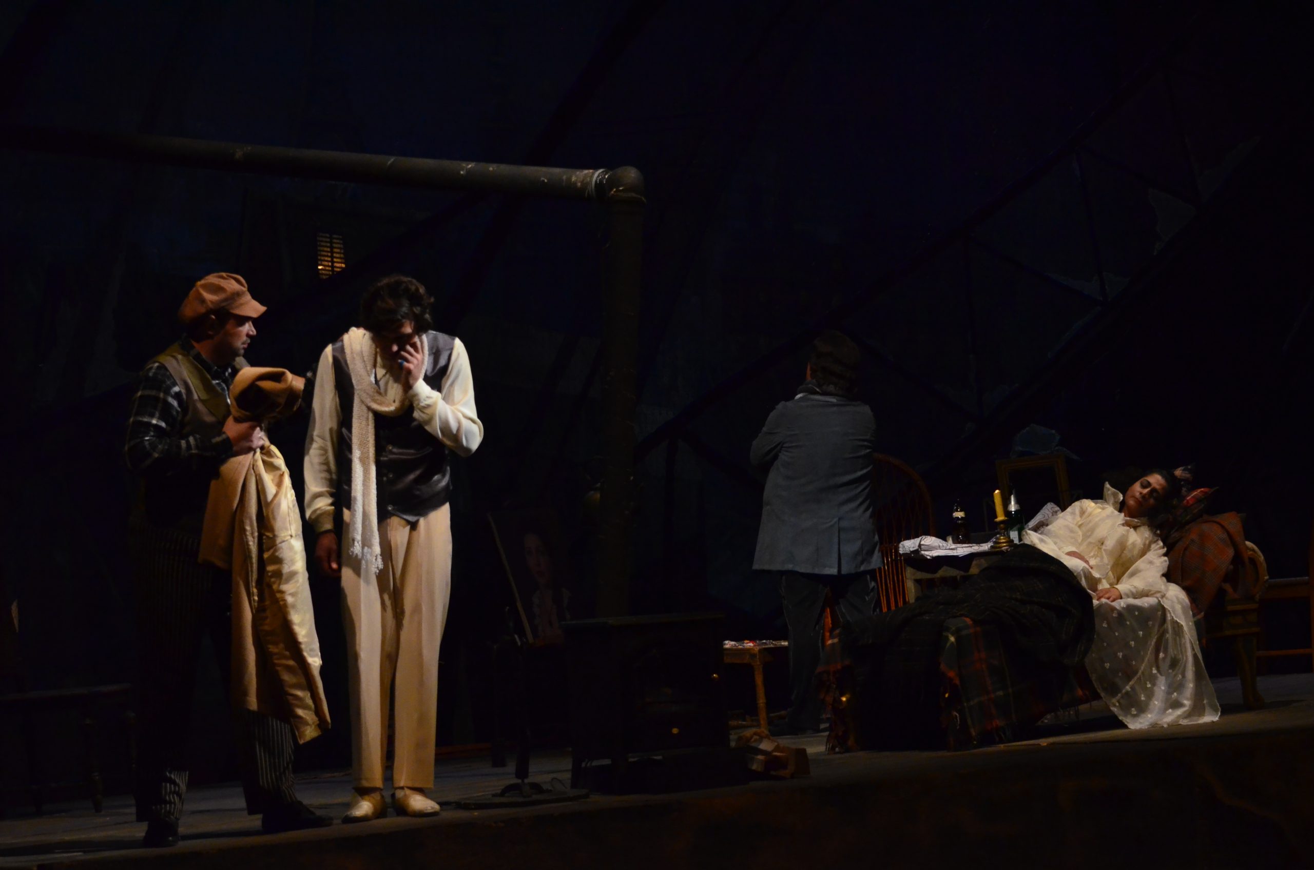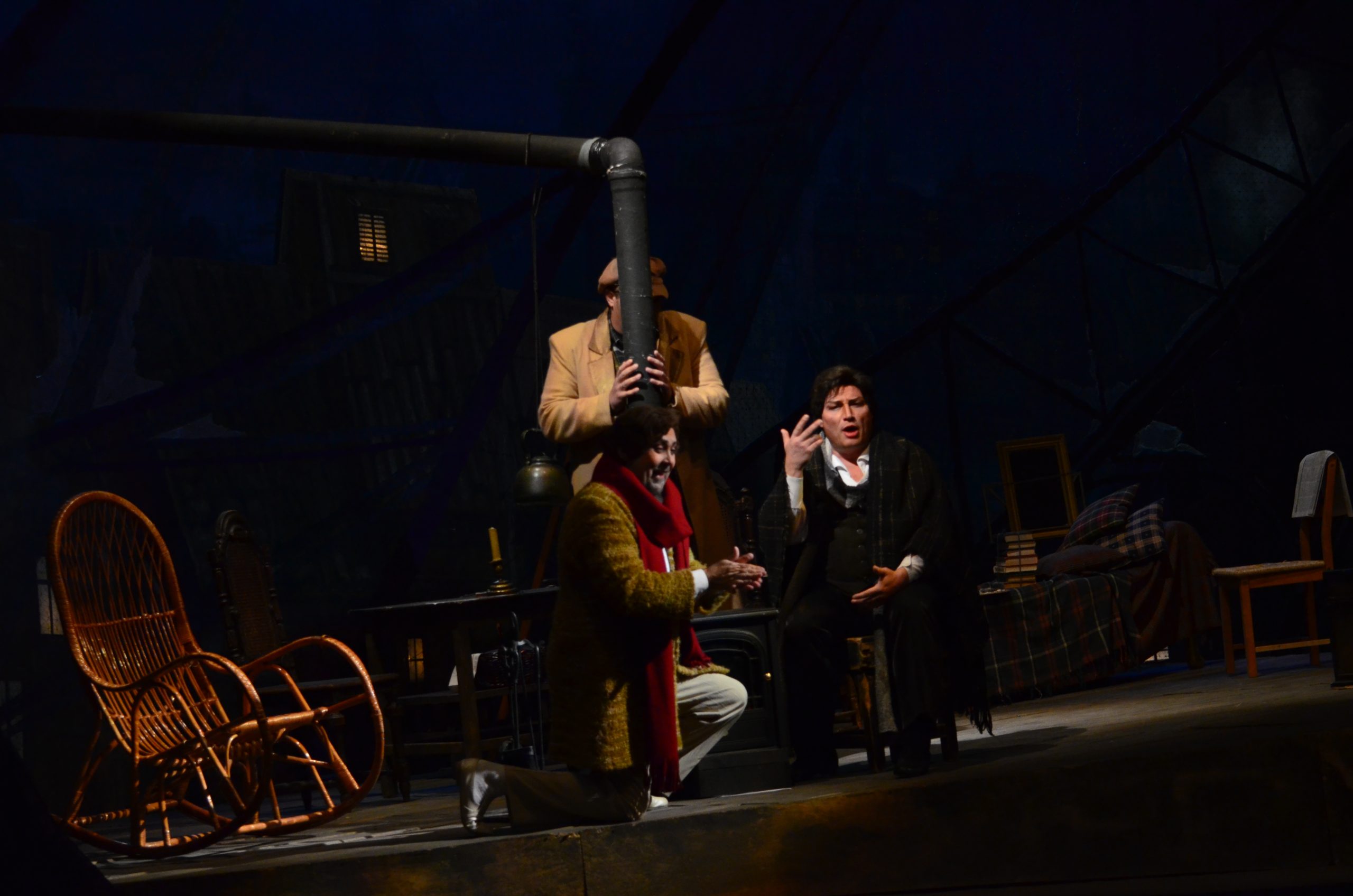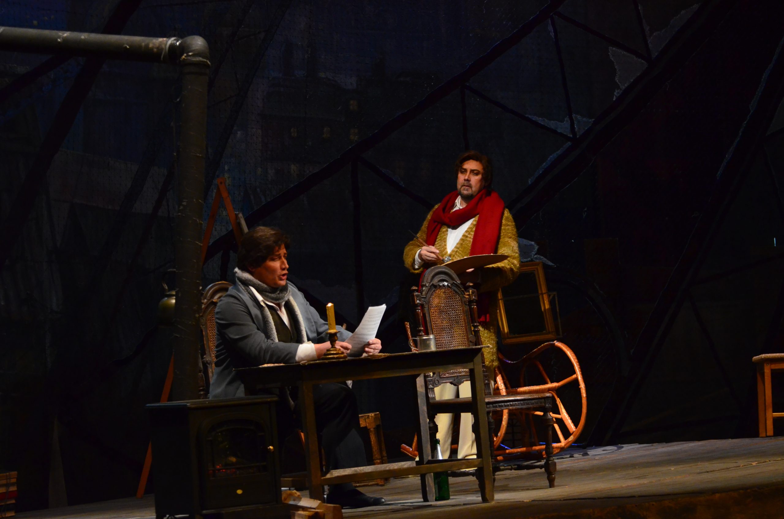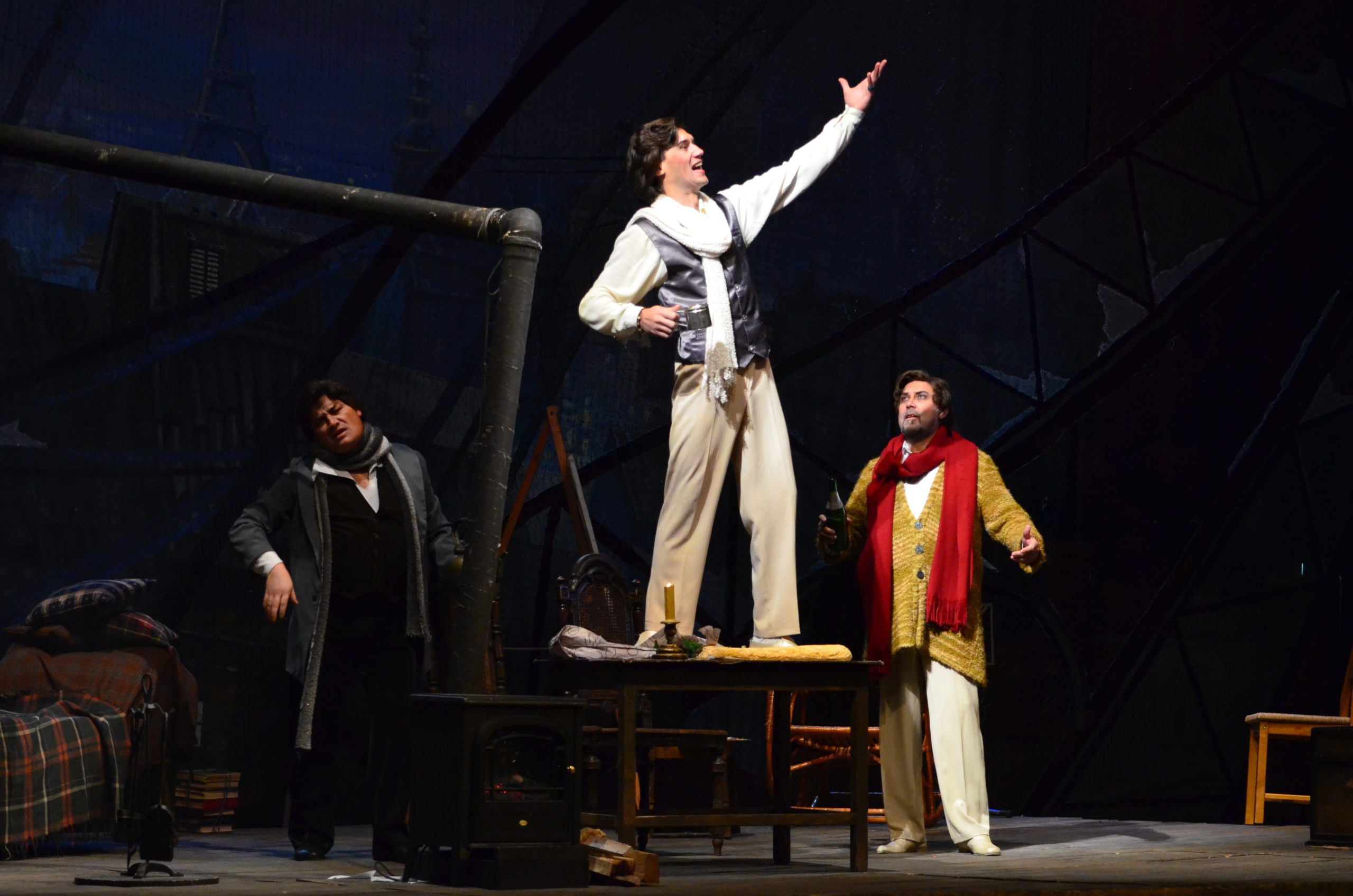 Поет Рудольф дивиться у вікно на покриті снігом дахи. Марсель працює над картиною. Друзі вирішують спалити рукопис драми Рудольфа, щоб зігрітися. З’являються філософ Колен, а потім і музикант Шонар, що заробив грошей і дістав дрова, тютюн, вино. Власник будинку Бенуа вимагає плату за житло, але молодикам щастить відкараскатися від нього. Оскільки сьогодні Святвечір, вони вирішують провести його в кафе у Латинському кварталі. Рудольф залишається на самоті, щоб закінчити статтю.