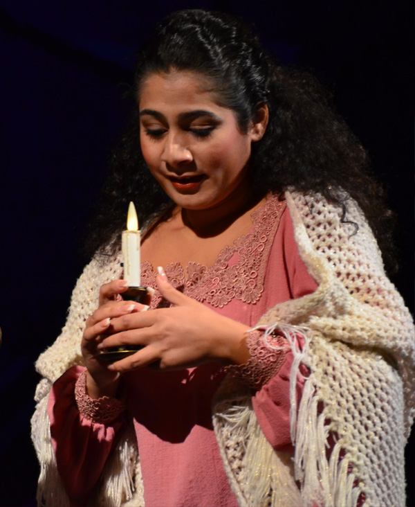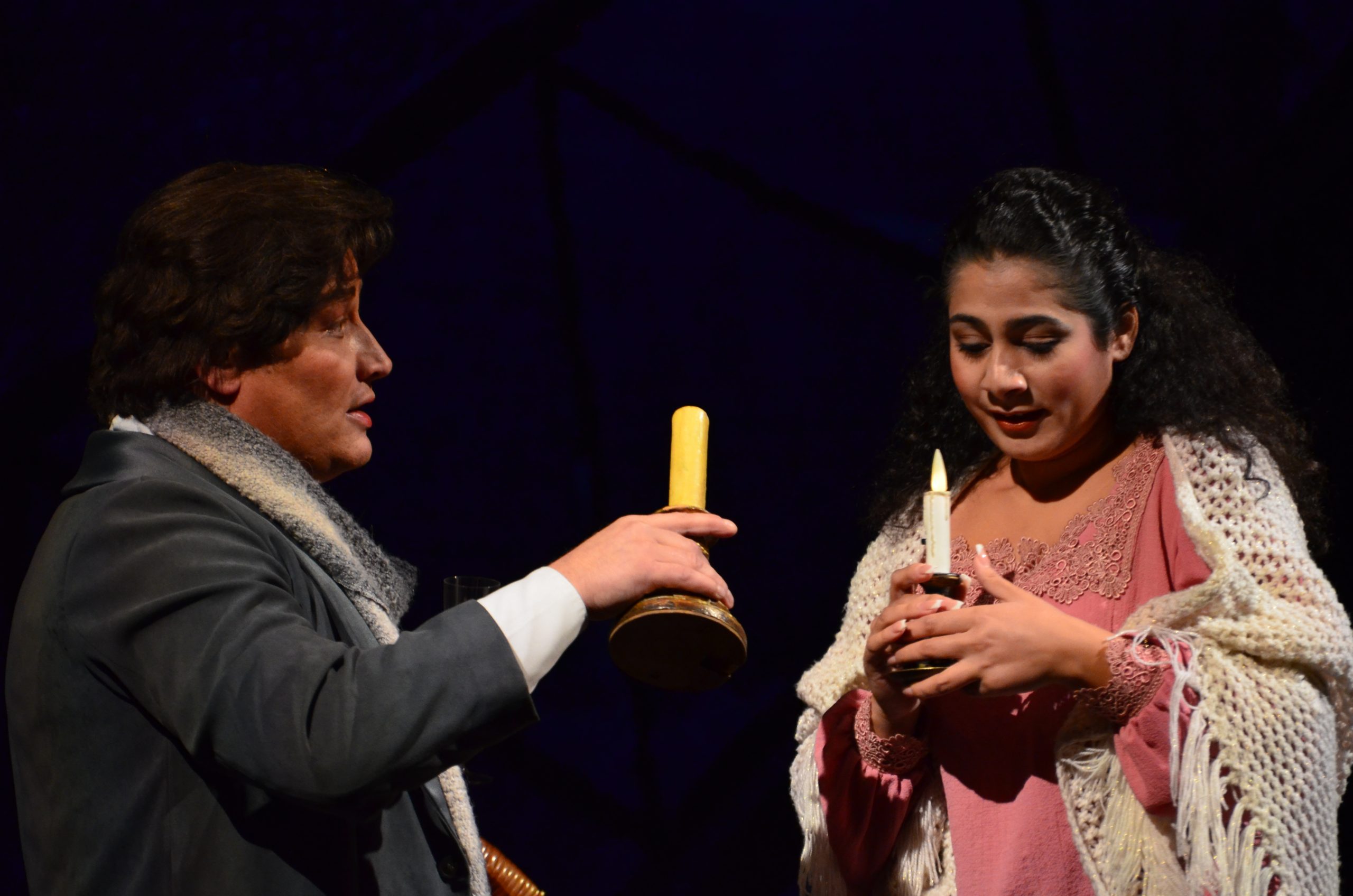 У двері тихенько стукають: це Мімі, дівчина, що живе в тому ж будинку, вона прийшла попросити вогню. Коли Мімі вже зібралась йти, то виявилось, що вона загубила ключ від своєї кімнати. Порив вітру задмухує її свічку, а свою Рудольф гасить навмисно. У темряві Рудольф розповідає про себе, стиснувши руку Мімі. Потім він просить Мімі сказати, хто вона. Друзі на вулиці просять Рудольфа поквапитись. Перед тим, як вирушити у Латинський квартал, він цілує Мімі.