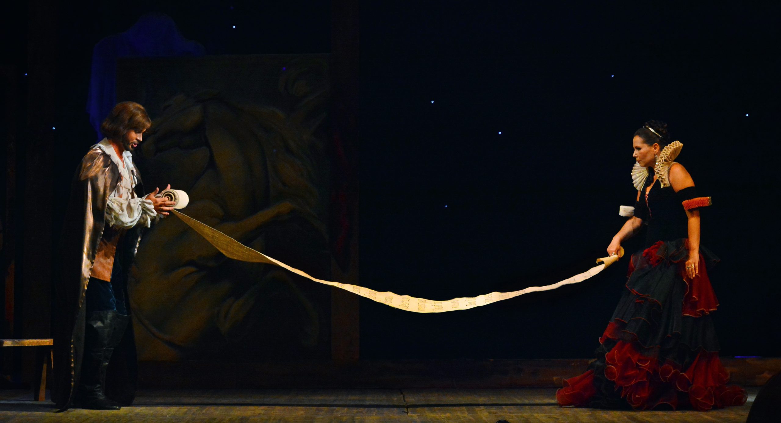 Головним візуальним образом вистави «Дон Жуан» на сцені нашого театру стає галерея створених головним героєм незакінчених портретів і статуй спокушених жінок: вони наче символізують щось прекрасне, якому не судилося бути завершеним. Дон Жуан – винуватець власної трагедії, тож його останнім фатальним витвором стає скульптура Командора.